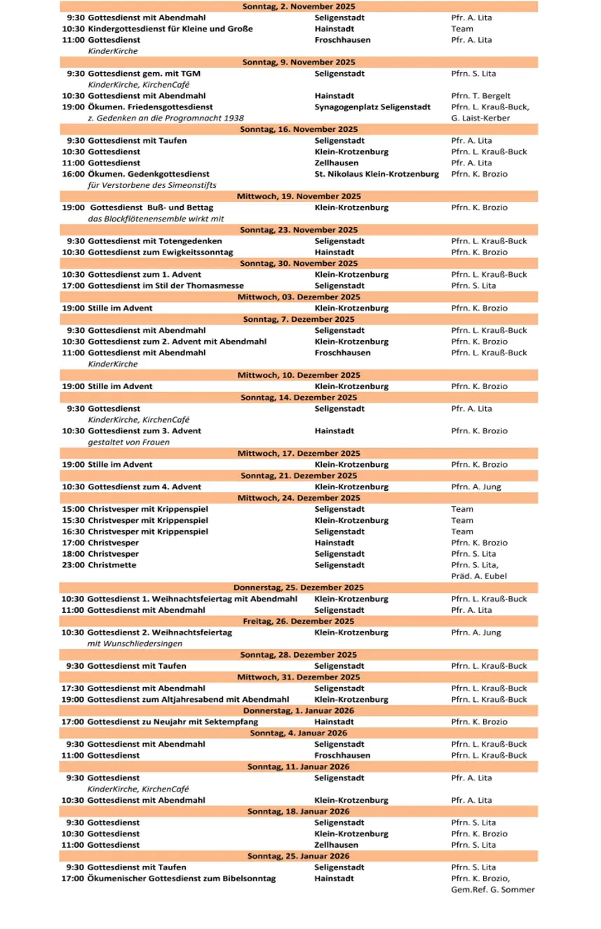 jeweils 19 Uhr in Hainstadt und Seligenstadt